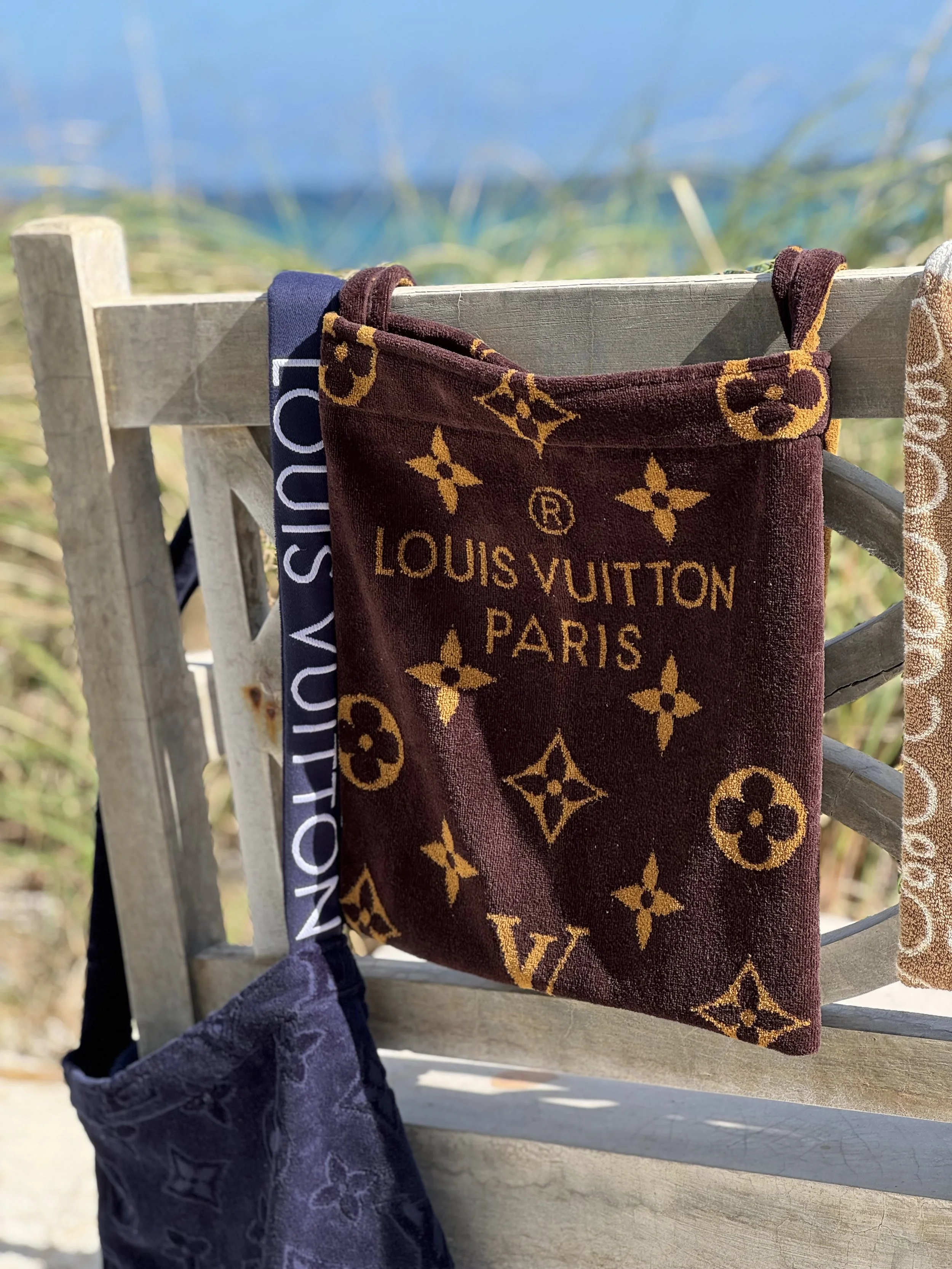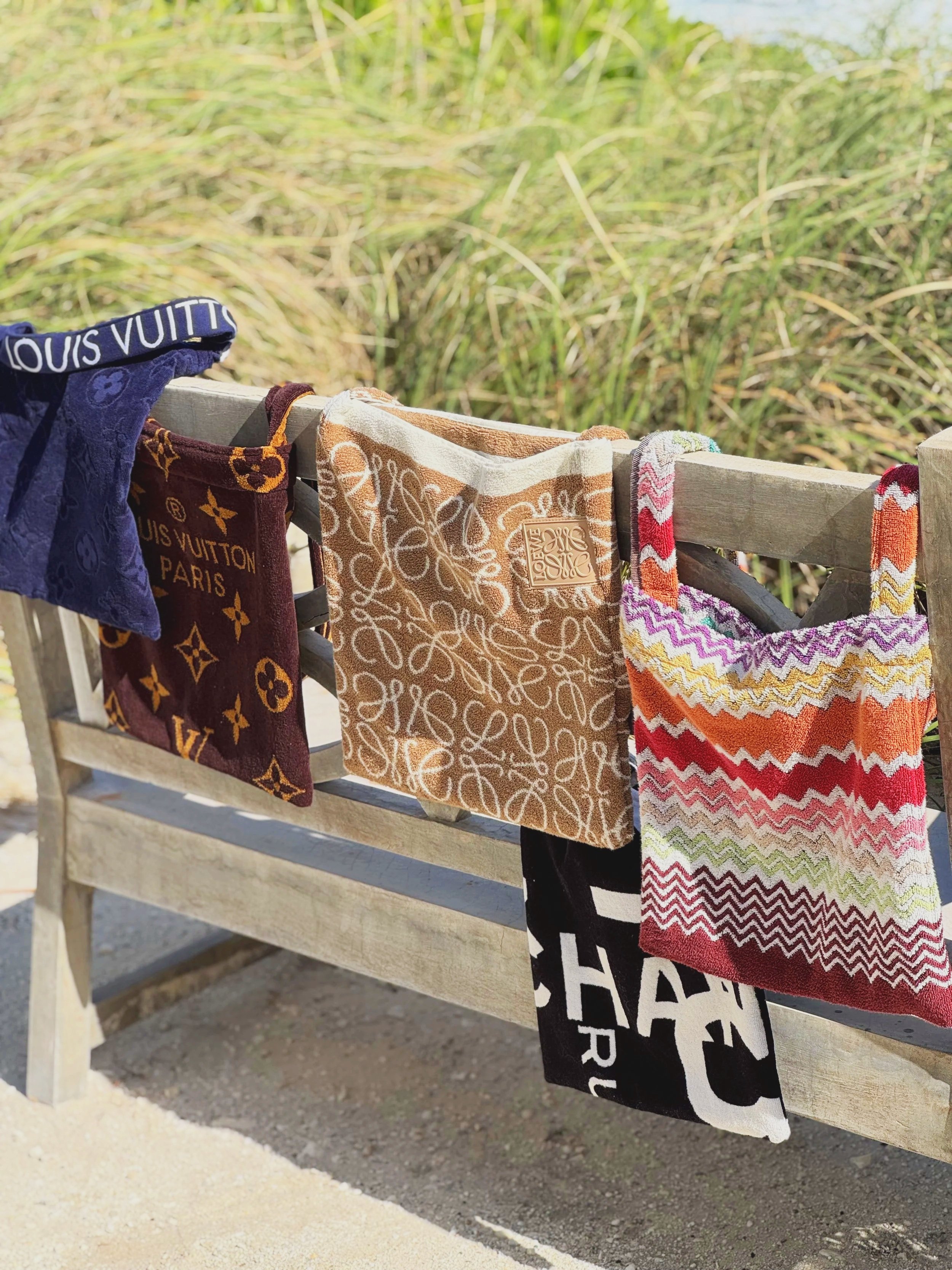 We thoughtfully redesign authentic designer towels into unique crossbody bags and totes. Each piece blends luxury craftsmanship with everyday fictionality- perfect for the beach, shopping, travel, or work.